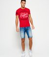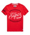 T-shirt homme Superdry Finery Goods. T-shirt à col rond et à manches courtes avec logo imprimé Superdry Finery Goods de style vintage sur la poitrine et numéro imprimé sur une manche. Le t-shirt porte une étiquette au-dessus de l'ourlet.